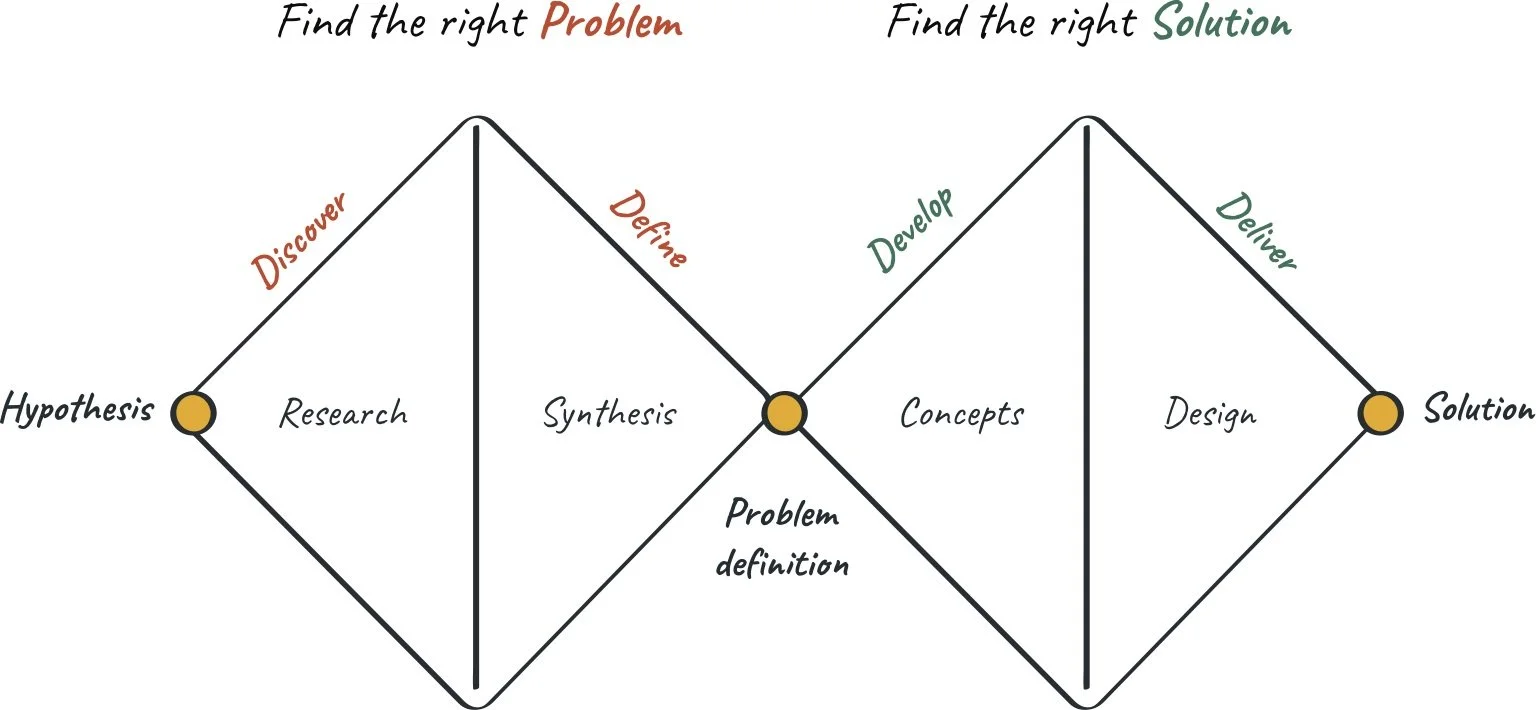 The first diamond addresses what, using research and analyses to gain insight into the problem space, while the second determines how through ideation, prototyping and testing.